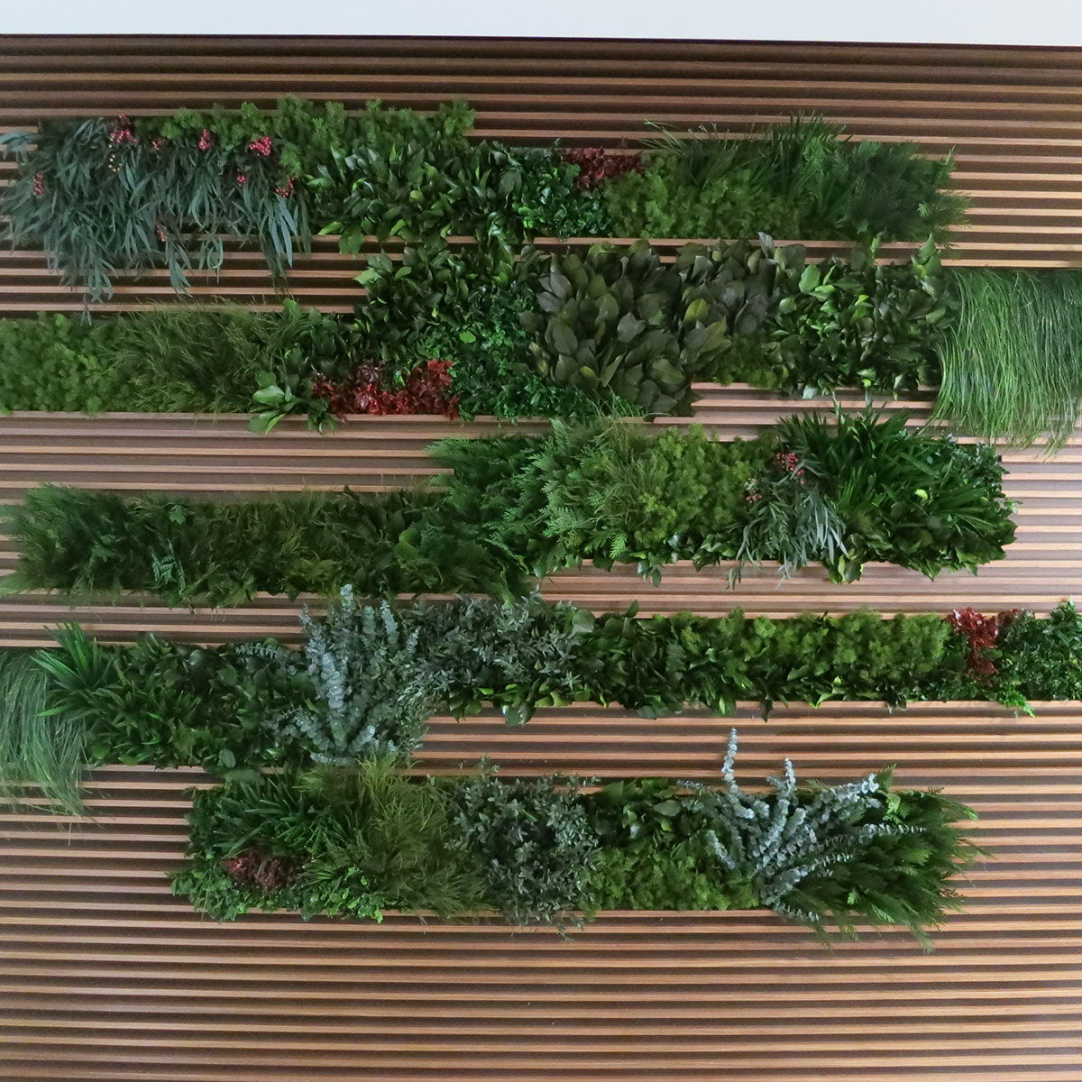 Project Overview: We were all taught as children to 'stay within the lines' and color neatly. This GOTW installation throws that mantra out the window! Overflowing with a breathtaking diversity of plant and floral species, GOTW's garden breaks out of the tightly packed lines in this intriguing millwork, and simply bursts with preserved nature - and breaking out of the lines at every opportunity. It's an artful execution that is at once soothing, exciting, and refreshing.